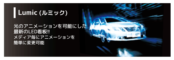 LumicはLEDの発光をアニメーション化することで、グラフィックデザインに動きをプラスして広告効果を高めます。既存の内照式看板では訴求効果が下がってしまっている場所などに効果を発揮します。また、デジタルサイネージでは訴求が難しい駅構内などの動線に効果を発揮します。